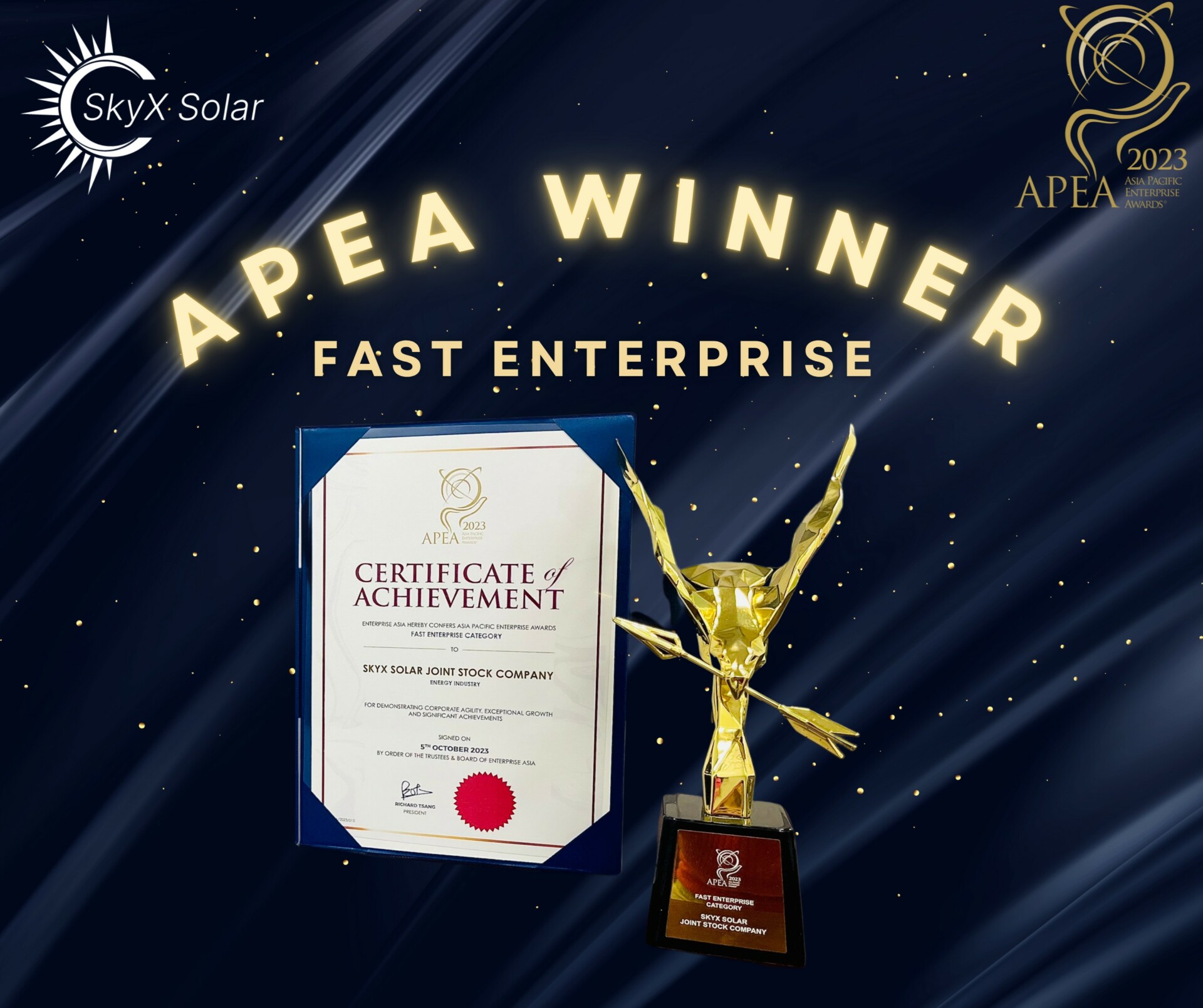 We are ecstatic to announce a win for SkyX Solar at the prestigious Asia Pacific Enterprise Awards 2023 (APEA) ceremony! On October 5th, we were honored to receive the Fast Enterprise Award in the Renewable Energy sector. This award recognizes our exceptional growth, innovation, and dedication to clean energy solutions.